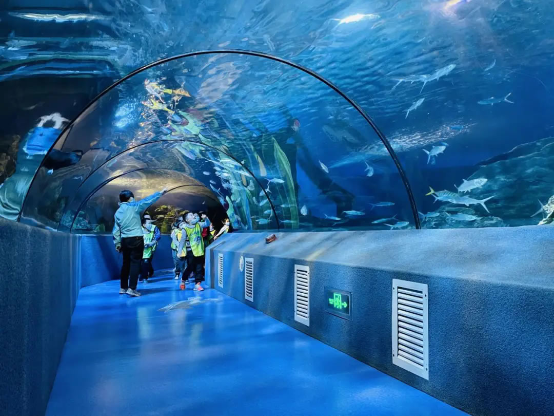 - 海底隧道:80米長、270度亞克力玻璃環(huán)繞,鯊魚、鰩魚從頭頂掠過,搭配丁達爾效應光影,形成震撼視覺體驗。