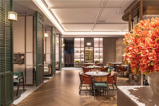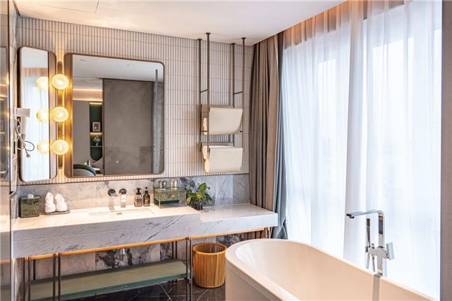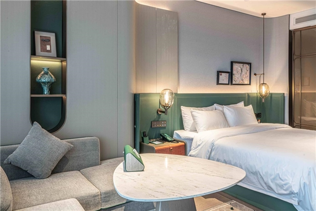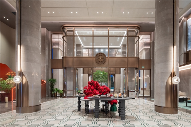酒店由法國設計師Jave操刀設計,以"楚韻新譯"為理念,巧妙融合現代奢華元素與荊楚文化傳統特色,打造出既具時代風尚又飽含文化底蘊的獨特空間。大堂主體采用大面積玻璃幕墻,搭配莫蘭迪紅綠配色點綴,白天,陽光透過玻璃傾灑,大堂內溫馨明亮,宛如璀璨水晶宮殿;夜晚,借助精妙燈光設計,呈現出迷人光影效果,成為城市夜色中耀眼的明珠。