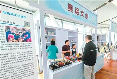 設(shè)在張家口市崇禮區(qū)國家跳臺滑雪中心內(nèi)的非遺手工藝品展臺。