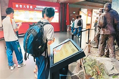 游客步入館內(nèi),仿佛踏入歷史的洪流。全息投影、文物陳列、場(chǎng)景復(fù)原等技術(shù)打造出數(shù)字化展陳空間。曾經(jīng)只能在文字和圖片中描繪的歷史場(chǎng)景,如今栩栩如生地呈現(xiàn)在眼前。在秘密大營(yíng)救展區(qū),雕塑還原文化名人在游擊隊(duì)員護(hù)送下離開的場(chǎng)景,當(dāng)觀眾點(diǎn)擊多媒體互動(dòng)裝置選擇不同的撤退路線時(shí),大屏幕會(huì)動(dòng)態(tài)還原當(dāng)時(shí)驚險(xiǎn)的轉(zhuǎn)移路徑,讓人如同身在其中,真切感受到革命先輩在槍林彈雨中的英勇機(jī)智。來自廣州的黃同學(xué)說:“有了這些多媒體設(shè)備,讓我更直觀了解到當(dāng)時(shí)槍林彈雨的危險(xiǎn)場(chǎng)景,也更好地學(xué)習(xí)了東江縱隊(duì)的歷史。”