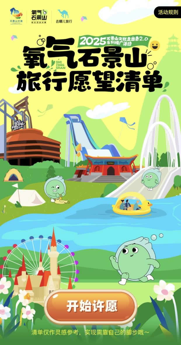 在“去哪兒”旅行APP上線“氧氣石景山”文旅專題頁(yè),不僅整合酒店榜單、景區(qū)門票、優(yōu)質(zhì)攻略等核心文旅資源,更特別設(shè)置石景山區(qū)對(duì)口支援和協(xié)作地文旅產(chǎn)品版塊,實(shí)現(xiàn)“石景山推廣+支援地區(qū)助銷”雙重價(jià)值。同步推出的“旅行打卡愿望清單”H5,線上用戶可點(diǎn)亮自己的石景山旅游心愿,生成專屬旅行愿望清單;在高校路演活動(dòng)中,大學(xué)生可分享H5到社交媒體作為參與活動(dòng)的入場(chǎng)券——既為高;顒(dòng)預(yù)熱,更成為高校路演入場(chǎng)憑證,串聯(lián)起“線上互動(dòng)-線下參與”的閉環(huán)。