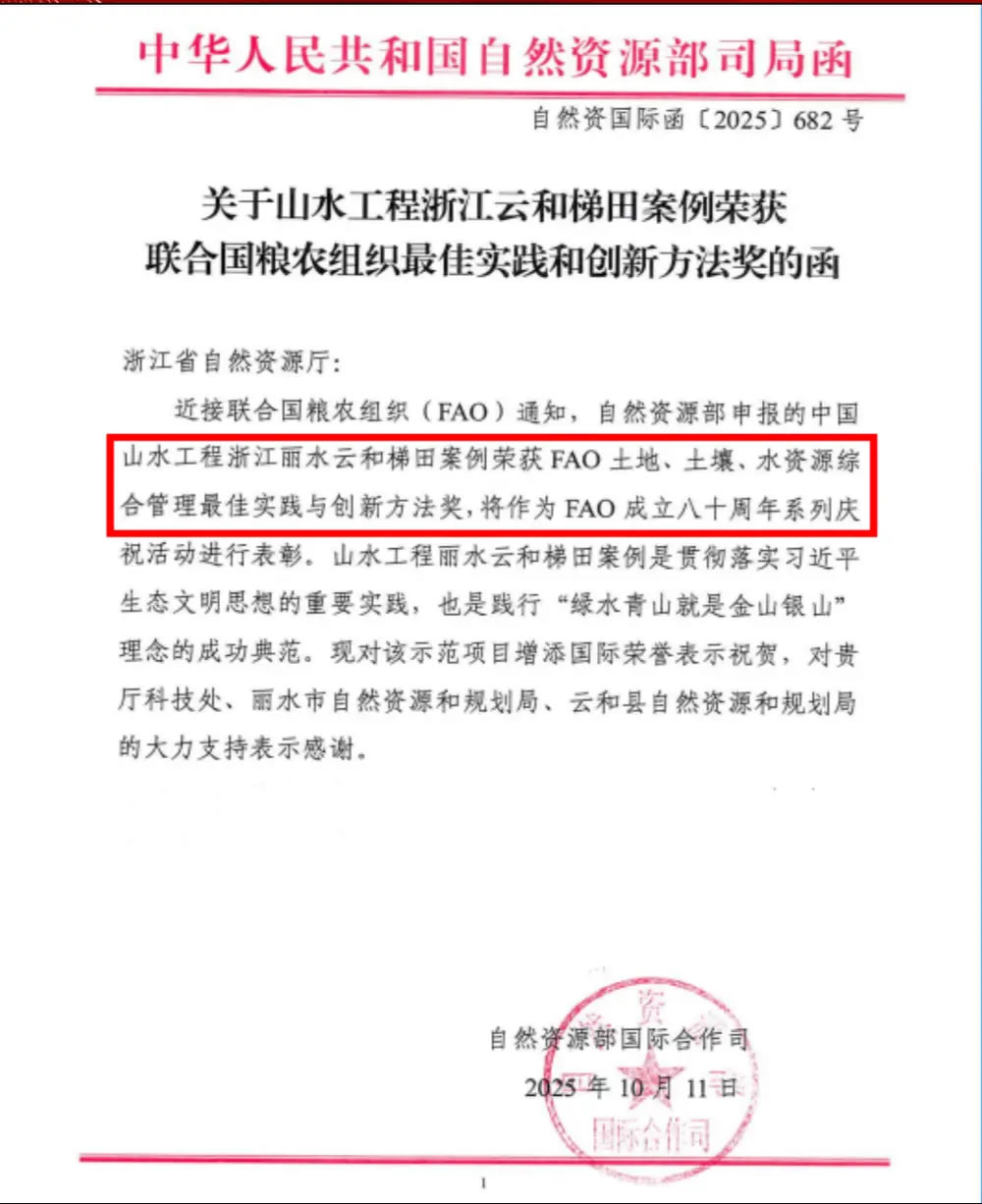 近日,中國山水工程浙江云和梯田項目榮獲聯(lián)合國糧農(nóng)組織最佳實踐和創(chuàng)新方法獎,并將作為聯(lián)合國糧農(nóng)組織(FAO)成立八十周年系列慶祝活動進行表彰。