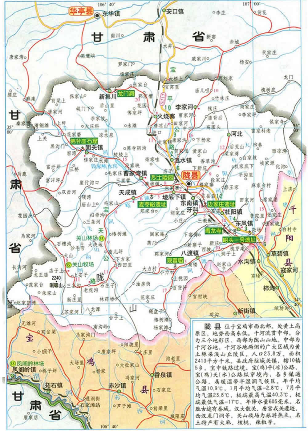隴縣,史稱隴州,因地處隴山東阪而得名,是陜西省西部的一個(gè)邊陲縣。東臨千陽(yáng),南接陳倉(cāng),西北部與甘肅清水、張家川、華亭、崇信、靈臺(tái)五縣毗鄰。版圖面積 2418平方公里,轄10鎮(zhèn)5鄉(xiāng)1個(gè)管委會(huì),158個(gè)行政村,1000個(gè)村民小組,總?cè)丝?5.03萬(wàn),其中農(nóng)業(yè)人口22.27萬(wàn)。寶中鐵路和204省道貫穿全境,為陜、甘、寧“三省通衢”和邊貿(mào)重鎮(zhèn)。